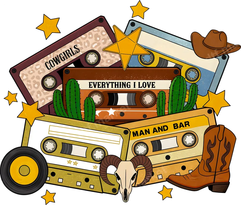 Cowgirl Country Music Cassettes DTF Transfer Western Boot Design