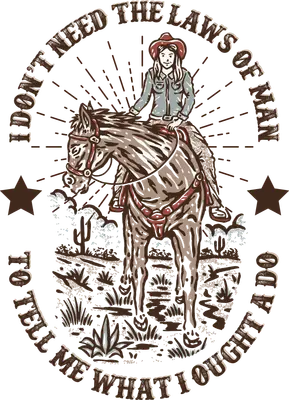 See allThis unique DTF transfer features a determined cowgirl riding her horse across a desert landscape, framed by the powerful, defiant quote: "I DON'T NEED THE LAWS OF MAN TO TELL ME WHAT I OUGHT TO DO." The design boasts a rustic, hand-drawn aesthetic with a weathered texture, perfectly capturing the spirit of independence and self-reliance. It's a striking ready to press design that combines classic Western imagery with a bold, free-spirited message, ideal for those who forge their own path. This design is perfect for fiercely independent women, cowgirls, equestrians, and anyone who lives by their own rules. It makes a fantastic statement piece for country music concerts, rodeo events, Western lifestyle enthusiasts, or simply as an everyday expression of personal freedom. Small boutique owners and crafters looking for unique iron on transfer designs with a powerful message will find this a popular choice for custom apparel. Gift it to a strong woman in your life who embodies a pioneering spirit. This versatile heat press transfer works beautifully on a wide range of fabrics, including cotton, polyester, cotton-poly blends, and even nylon. Application is straightforward: simply use a heat press at 300-325°F for 15 seconds with medium pressure, or apply with a household iron. There's no tedious weeding required – just peel and press! It's perfect for creating custom t-shirts, cozy hoodies, stylish sweatshirts, practical tote bags, and rugged denim jackets. For best longevity, wash garments inside out and tumble dry on low heat. Experience professional results with this high-quality ready to press transfer. It delivers vibrant, full-color printing with exceptional detail, ensuring your finished product looks stunning. The print is crack-resistant and boasts a soft feel, unlike heavy vinyl. Each direct to film transfer is produced on premium DTF film, complete with a robust adhesive backing for reliable application and lasting durability on any garment.