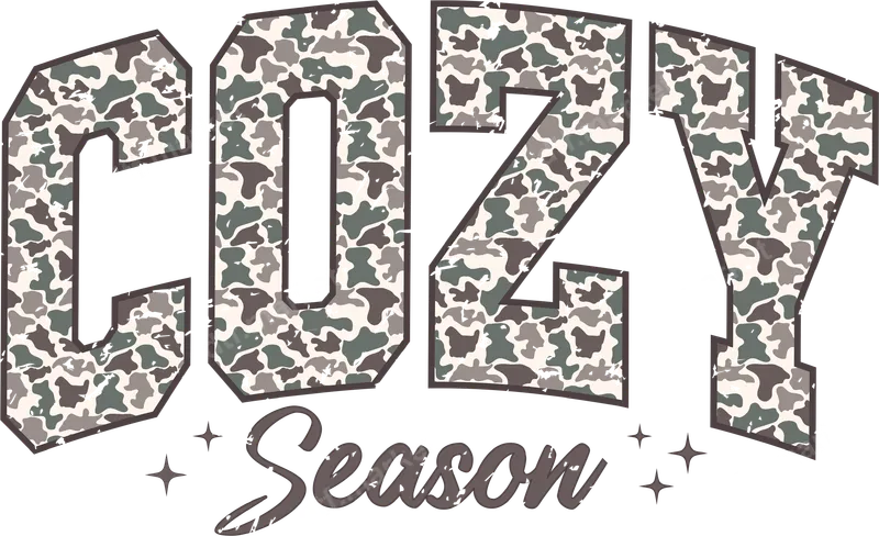 See allThis stylish DTF transfer features the word "COZY" in bold, collegiate-style letters, filled with a rustic, distressed camouflage pattern in shades of green, gray, and cream. Below, "Season" is elegantly scripted in a complementary distressed font, flanked by subtle star accents, creating a warm and inviting feel. This ready to press design is perfect for adding a touch of casual comfort to your apparel for the cooler months. Ideal for anyone who loves fall fashion, comfort wear, or a relaxed aesthetic, this heat transfer makes a fantastic gift for friends and family, or a treat for yourself. Perfect for autumn gatherings, holiday lounging, or everyday cozy wear, this unique t-shirt transfer is suited for students, outdoor enthusiasts, or anyone embracing the "hygge" lifestyle. Customize shirts for your next camping trip, bonfire night, or just a lazy Sunday. Applying this heat press ready design is straightforward and efficient. Compatible with a wide range of fabrics including cotton, polyester, and poly-blends, this iron on transfer adheres seamlessly. For best results, use a heat press at 300-325°F for 15 seconds with medium pressure, followed by a warm peel. Unlike traditional vinyl transfers, there's no weeding required, making custom apparel creation quick and hassle-free. Experience professional-grade quality with our direct to film transfers. The vibrant, crack-resistant inks ensure your design remains eye-catching and durable, wash after wash. Each apparel transfer offers a soft hand feel and excellent stretch, maintaining comfort without compromising on style. Our premium DTF film and strong adhesive provide a lasting bond, ensuring your custom creation stands out.