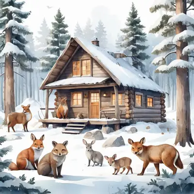 Cozy Winter Cabin Wildlife DTF Transfer - Fox & Deer Snowy Scene