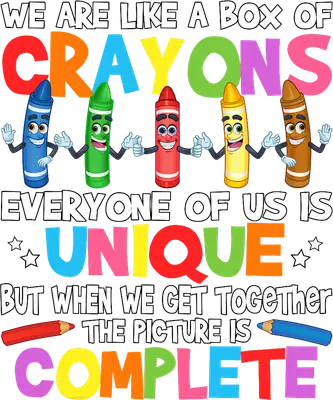 See allThis vibrant and inspiring DTF transfer features a cheerful array of anthropomorphic crayons, each with a unique color and personality, standing together. The design proudly displays the heartwarming message: "WE ARE LIKE A BOX OF CRAYONS EVERYONE OF US IS UNIQUE BUT WHEN WE GET TOGETHER THE PICTURE IS COMPLETE." It's a colorful and uplifting statement about diversity, unity, and teamwork, making it a perfect ready to press design to spread positivity. This heartwarming heat transfer design is perfect for educators, students, school staff, and anyone who champions inclusivity and collaboration. Ideal for back-to-school events, teacher appreciation gifts, classroom projects, team-building activities, or creating matching group shirts for clubs and organizations. It’s also a fantastic iron on transfer for crafting unique gifts for mentors or classmates, making a thoughtful statement on any apparel. Applying this heat press transfer is simple and efficient. It adheres beautifully to various fabrics including cotton, polyester, cotton-poly blends, and even nylon. For best results, use a heat press at 300-325°F for 15 seconds with medium pressure. A household iron can also be used with care. No tedious weeding is required – just peel and press! Create stunning custom t-shirts, hoodies, sweatshirts, tote bags, pillow covers, and aprons. For lasting durability, wash garments inside out and tumble dry low. Experience superior quality with this ready to press transfer. It boasts vibrant, full-color printing that captures every fine detail of the cheerful crayon characters and inspiring typography. The result is crack-resistant and soft to the touch, without the heavy, stiff feel often associated with vinyl. Each direct to film transfer is meticulously printed on premium DTF film with a strong adhesive backing, ensuring professional and long-lasting results for all your custom creations.