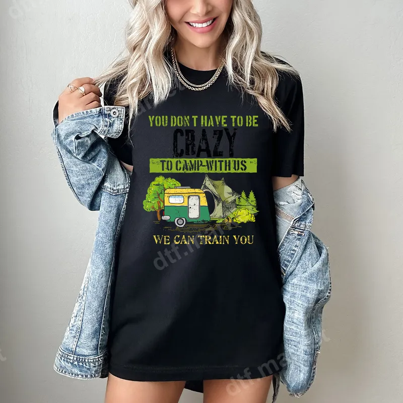 See allEmbrace the fun of the great outdoors with our "You Don't Have To Be Crazy To Camp With Us, We Can Train You" DTF transfer. This playful design perfectly captures the spirit of camping adventures, featuring a charming retro camper, a cozy tent, and lush trees. It's a ready to press design that combines humor with a love for nature, making it ideal for anyone who enjoys the open road and starry nights. This vibrant direct to film transfer ensures your apparel stands out. This unique heat press transfer is perfect for avid campers, RV enthusiasts, glamping gurus, and anyone who appreciates a good laugh around the campfire. It makes an excellent gift for Father's Day, birthdays, summer vacations, or as a fun addition to group camping trip outfits. Easily create custom t-shirts for your crew, or add a personalized touch to your gear with this hilarious iron on decal. Applying your new apparel transfer is simple and efficient. Our DTF transfers work beautifully on a wide range of fabrics, including 100% cotton, polyester, and blends. For best results, use a heat press at 300-325°F for 15 seconds with medium pressure, then cold peel. A household iron can also be used. Forget tedious weeding or layering – this heat press ready design is hassle-free. Experience professional quality with every application. Our DTF transfers are known for their exceptional durability, vibrant colors, and soft hand feel. The designs are crack-resistant and withstand numerous washes, ensuring your customized garments look great for a long time. Each t-shirt transfer is made with premium DTF film and strong adhesive, providing a flawless finish.