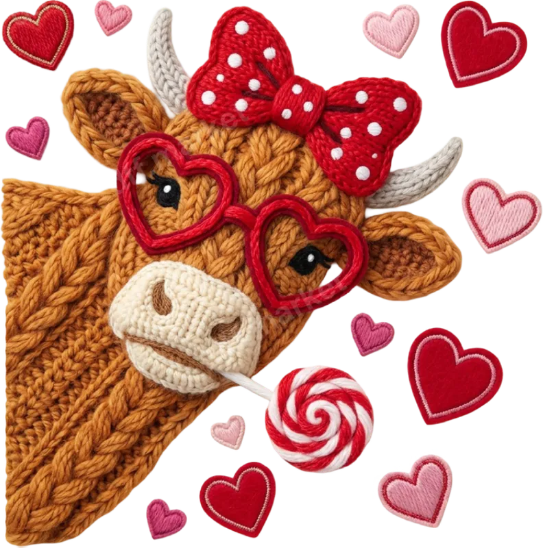 See allThis delightful DTF transfer features an intricately designed crocheted cow, capturing a heartwarming and charming aesthetic. The cow sports fashionable red heart-shaped glasses, a matching polka-dot bow, and playfully holds a red and white swirl lollipop, all surrounded by sweet embroidered hearts in shades of red and pink. This ready to press design brings a unique, textured look to any garment, blending country charm with a touch of modern cuteness. This adorable design is perfect for anyone who loves farm animals, Valentine's Day, or simply appreciates cute and whimsical apparel. It makes an excellent iron on transfer for crafting personalized gifts for girlfriends, moms, daughters, or best friends. Ideal for celebrating Valentine's Day, anniversaries, birthdays, or just showing affection, this sweet image is sure to bring a smile to anyone's face. Our high-quality heat press transfers are incredibly versatile, adhering beautifully to a wide range of fabric types, including cotton, polyester, and various blends. Applying your custom design is straightforward: use a heat press at 300-325°F for 15 seconds with medium pressure, or even a household iron for smaller projects. These heat press ready designs save you time and effort as there's no tedious weeding required, unlike traditional vinyl transfers. Experience superior quality with our direct to film transfers. Each transfer boasts vibrant colors, exceptional durability, and a soft, lightweight feel that integrates seamlessly with the fabric. Printed on professional-grade DTF film with a strong, flexible adhesive, these designs are engineered to be crack-resistant and long-lasting, ensuring your apparel looks fantastic wash after wash.