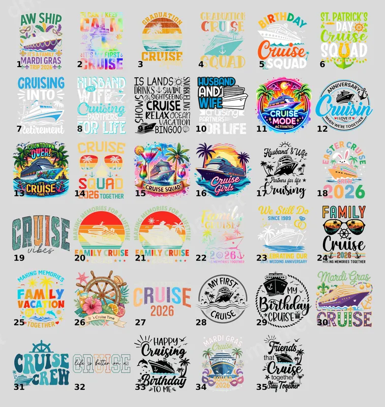 See allSet sail in style with our vibrant 'Cruise Mode Activated' DTF transfer! This eye-catching design features a lively cruise ship against a tropical sunset, flanked by swaying palm trees and refreshing cocktails. It perfectly captures the excitement and relaxation of a perfect vacation. This high-quality direct to film transfer is ready to press, making it easy to bring your cruise-themed apparel to life. Ideal for cruise enthusiasts, vacationers, and anyone counting down to their next sea adventure. This heat press design is perfect for family trips, bachelorette parties, couple getaways, or group excursions. It makes an excellent gift for friends celebrating a milestone cruise. Perfect for pre-cruise parties, onboard events, or as a souvenir. Applying this professional heat transfer is a breeze on cotton, polyester, and blends. For best results, use a heat press at 300-325°F for 15 seconds with medium pressure. A household iron can also be used. Forget about complex weeding or layering; this ready to press transfer applies quickly and flawlessly, saving you time and effort. Our premium iron on transfer delivers exceptional durability and vivid colors that pop. The design is crack-resistant and boasts a soft, lightweight feel once applied, ensuring maximum comfort. Printed on professional DTF film with a strong adhesive, this apparel transfer ensures a long-lasting, high-quality finish that will stand up to many washes and adventures. Get ready to show off your cruise spirit!