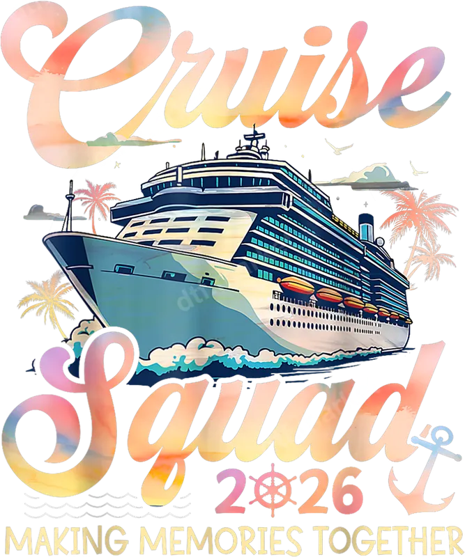 See allThis vibrant DTF transfer features a beautiful cruise ship sailing on the open water, surrounded by tropical palm trees and playful seagulls. The design proudly displays "Cruise Squad" in a stylish, watercolor-effect script, along with "2026" (featuring a ship's wheel) and the heartwarming message "MAKING MEMORIES TOGETHER." This eye-catching ready to press design perfectly captures the excitement and camaraderie of a group cruise vacation. Ideal for anyone planning a memorable cruise in 2026, this heat press transfer is perfect for family reunions at sea, friend getaways, or group excursions. Create matching t-shirts for everyone in your party, celebrate a special anniversary cruise, or commemorate a retirement trip. It's also a thoughtful gift for fellow travelers or cruise enthusiasts looking forward to their next adventure. Our premium DTF transfers are incredibly versatile, adhering flawlessly to a wide range of fabrics including cotton, polyester, and their blends. For best results, apply with a heat press at 300-325°F for 15 seconds with medium pressure. Even if you don't have a heat press, a household iron can be used following similar temperature guidelines. Enjoy a professional finish without the hassle of weeding or layering, making your DIY apparel projects a breeze. Experience superior quality with our durable direct to film transfers. Each iron on transfer boasts incredibly vibrant colors that pop, along with exceptional stretch and crack resistance for long-lasting wear. The soft-touch finish integrates beautifully with your garment, ensuring maximum comfort. Printed on professional-grade DTF film with a strong, reliable adhesive, these shirt designs are built to withstand countless washes while maintaining their original brilliance.