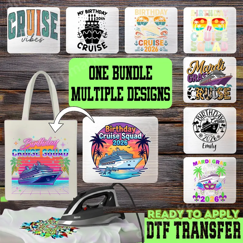 See allEmbark on your next adventure with our exclusive Cruise Vacation DTF Transfer Bundle, featuring multiple vibrant designs perfect for any sea-faring journey. This ready to press collection includes everything from retro "Cruise Vibes" and specific "Birthday Cruise Squad" designs to festive "Mardi Gras Cruise" graphics, ensuring you have the perfect heat transfer for every crew member. Each design captures the excitement of a tropical getaway, with detailed cruise ships, palm trees, and celebratory elements. This versatile bundle is ideal for anyone planning a cruise, whether it's a milestone birthday celebration, a lively Mardi Gras trip, a family vacation, or just a fun group getaway. Create matching shirts for your cruise squad, personalized tote bags, or custom apparel for a memorable trip. These iron on transfers make fantastic gifts for travel enthusiasts and are perfect for pre-cruise party preparations or reunion events. Applying these heat press designs is a breeze! Our premium DTF transfers work seamlessly on a wide range of materials, including cotton, polyester, and various fabric blends. For best results, use a heat press at 300-325°F for 15 seconds with medium pressure. A household iron can also be used with firm, even pressure. Enjoy a weed-free application process, saving you time and effort to focus on your travel plans. Experience professional quality with every application. Our direct to film transfers boast vibrant colors that pop, exceptional durability, and a soft, flexible feel that won't crack or peel. Crafted with high-quality DTF film and strong adhesive, these apparel transfers are designed to withstand countless washes while maintaining their stunning look. Elevate your cruise wardrobe with these ready-to-press transfers that offer both style and longevity.