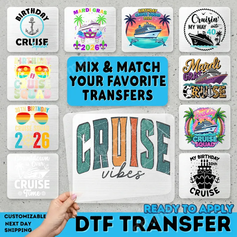 See allEmbrace the ultimate vacation spirit with our 'CRUISE vibes' DTF transfer. This vibrant, ready-to-press design features bold, distressed lettering in a cool retro style, perfect for capturing that relaxed, groovy cruise aesthetic. The unique vintage texture adds character, making it a standout addition to any apparel. This direct to film transfer is designed for easy application and maximum visual impact. This 'CRUISE vibes' heat transfer is ideal for anyone embarking on a fun-filled sea adventure. Whether you're planning a family cruise, a friends' getaway, a birthday celebration at sea, or simply dreaming of your next voyage, this design makes perfect custom t-shirts, tank tops, or tote bags. It’s also a fantastic gift for cruise enthusiasts and travel lovers, ensuring everyone looks stylish and coordinated for their nautical journey. Applying this heat press design is a breeze. Our premium iron on transfer works seamlessly on a wide range of fabrics, including cotton, polyester, and various blends. For best results, use a heat press at 300-325°F for 15 seconds with medium pressure. A household iron can also be used, making it accessible for everyone. Enjoy professional-quality results with no tedious weeding required, letting you create custom apparel in minutes. Experience superior durability and feel with our high-quality DTF transfers. This apparel transfer boasts vibrant, true-to-color inks that resist cracking, peeling, and fading, ensuring your design looks fresh wash after wash. The soft-touch finish integrates beautifully into the fabric, providing comfort without stiffness. We use professional-grade DTF film with strong adhesive, guaranteeing a long-lasting, professional finish for all your custom creations.