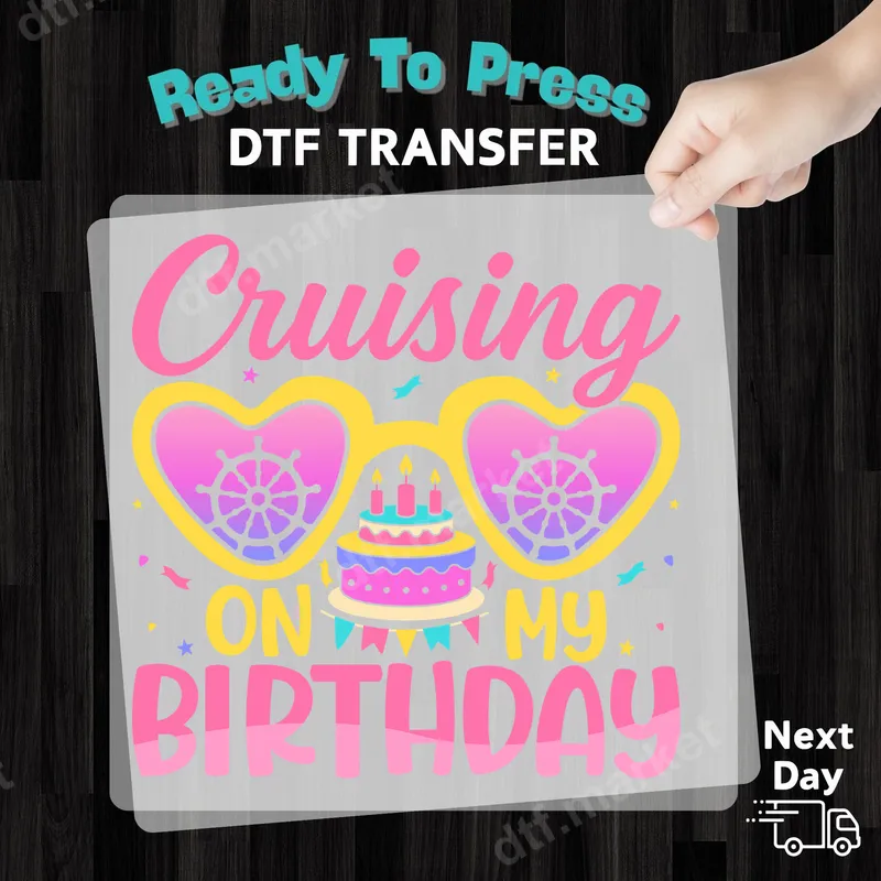 See allThis vibrant 'Cruising On My Birthday' DTF transfer is a perfect ready to press design for anyone celebrating their special day at sea or with a festive cruise theme. Featuring playful pink lettering, heart-shaped sunglasses with ship wheels, and a charming birthday cake, this DTF transfer captures the fun and excitement of a birthday celebration. The bright colors and cheerful imagery make it an instant favorite for personalized garments, ensuring your birthday outfit stands out. This festive design is ideal for birthday celebrants, cruise enthusiasts, and groups on vacation or girls' trips. It makes a fantastic gift for friends or family planning a birthday cruise, or simply for anyone who loves the idea of celebrating their big day with a nautical flair. Whether it's for a pre-cruise party, the actual trip, or a post-vacation memory, this unique heat transfer transforms ordinary apparel into a personalized celebration piece. Our professional DTF transfers are incredibly versatile and easy to apply. They work flawlessly on a wide range of materials, including cotton, polyester, and various blends. For best results, use a heat press at 300-325°F for 15 seconds with medium pressure, then cold peel the film. A household iron can also be used with care. There's no complex weeding required – simply press and enjoy your custom creation. Experience superior quality with our Direct-to-Film transfers. Each iron on transfer is crafted using premium film and inks, resulting in a design that is exceptionally vibrant, soft to the touch, and highly durable. Our heat press designs are crack-resistant and hold up beautifully wash after wash, making this professional t-shirt transfer a long-lasting addition to any wardrobe. Elevate your birthday celebrations with a design that's as unique and joyful as you are.