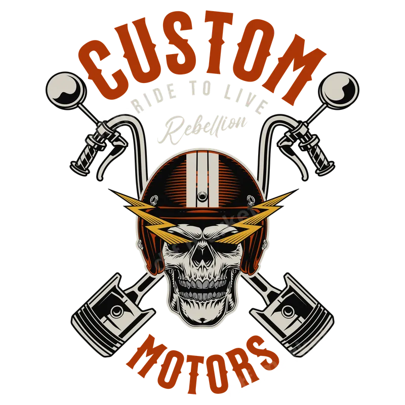 See allEmbrace the spirit of the open road with this bold Custom Motors Biker Skull Helmet DTF transfer. Featuring a defiant skull sporting a vintage racing helmet with lightning bolts, flanked by crossed motorcycle handlebars and engine pistons, this design exudes raw power and custom culture. The impactful text “CUSTOM MOTORS” frames the graphic, with “RIDE TO LIVE Rebellion” subtly woven into the design. This high-quality direct to film transfer is ready to press, offering a professional finish for your apparel projects. This edgy design is perfect for motorcycle enthusiasts, biker club members, hot rod fans, and anyone who lives by their own rules. It makes an excellent gift for mechanics, custom shop owners, or friends who appreciate a strong, rebellious aesthetic. Ideal for custom apparel for rallies, bike meets, or simply to showcase a passion for motors and freedom, this heat press design is sure to turn heads and resonate with the 'ride to live' mentality. Applying this heat transfer is straightforward for professional results. It adheres beautifully to a wide range of fabrics, including cotton, polyester, and their blends, making it a versatile iron on transfer. For best results, use a heat press at 300-325°F for 15 seconds with medium pressure. There's no tedious weeding required, simplifying your customization process. You can even use a household iron for smaller projects. Crafted using premium DTF film and vibrant, crack-resistant inks, this apparel transfer ensures your designs stand out and last. The soft-touch finish integrates seamlessly with the fabric, providing comfort and durability. Experience vibrant colors and sharp details with every press, transforming ordinary garments into statements of individuality with this ready to press transfer.