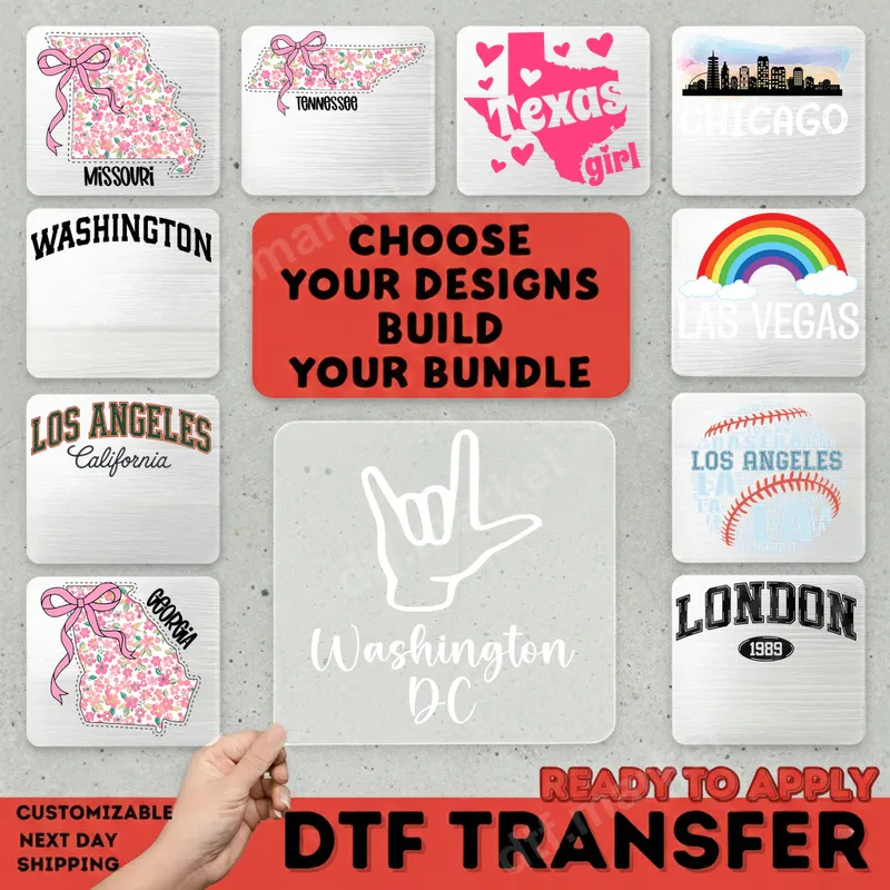 See allDiscover a fantastic collection of diverse DTF transfer designs celebrating city and state pride, perfect for personalizing your wardrobe. Our ready to press transfers feature iconic locations like Chicago, Los Angeles, London, and various US states such as Texas, Missouri, and Georgia, each with unique artistic flair. From elegant floral state maps with charming bows to bold collegiate-style city names and skyline silhouettes, this selection offers a wide range of aesthetic options for expressing your local love or travel adventures. Each high-quality direct to film transfer is designed for vivid detail and professional results. These versatile heat transfers are ideal for anyone looking to showcase their hometown pride, commemorate a favorite travel destination, or create personalized gifts. Perfect for tourists, local residents, sports fans, and those with a love for specific cities or states. They make excellent additions to souvenir shops, craft projects, family reunion apparel, or as unique gifts for birthdays, holidays, or any special occasion celebrating a connection to a beloved place. Show your spirit whether you're a "Texas girl" or celebrating "Washington DC." Applying your new custom transfer is incredibly easy, transforming plain garments into personalized masterpieces. Our durable iron on decals adhere beautifully to a wide variety of fabrics, including 100% cotton, polyester, and cotton/poly blends, making them perfect for almost any apparel project. Simply use a heat press at 300-325°F for 15 seconds with medium pressure for professional results, or a household iron with firm, even pressure. Enjoy the convenience of no weeding required, getting straight to pressing your unique shirt design. Crafted using premium DTF film and advanced printing technology, these apparel transfers boast exceptional quality. You'll love the vibrant colors, crisp details, and soft-to-the-touch finish that blends seamlessly with your fabric. Our heat press designs are engineered to be crack-resistant, peel-resistant, and incredibly durable, ensuring your personalized items look fantastic wash after wash. Experience the professional difference of our high-quality, long-lasting direct to film transfers for all your customization needs.