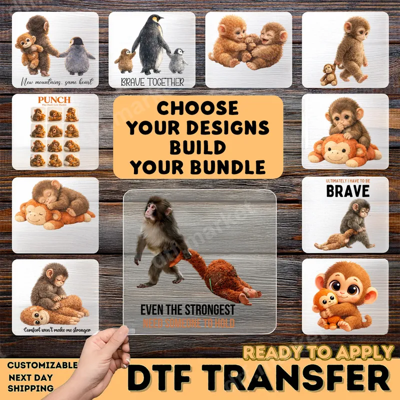 See allOur collection of adorable DTF transfer designs features heartwarming baby animals paired with uplifting inspirational quotes. From mischievous monkeys to charming penguins, each ready to press graphic radiates warmth, courage, and togetherness. Designs like 'Brave Together' and 'Even the Strongest Need Someone to Hold' capture a sweet, comforting vibe perfect for personalizing any item. These vibrant images are designed to bring a smile and a touch of encouragement wherever they go. These charming designs are ideal for parents, grandparents, and anyone who cherishes the bond of family and friendship. They make wonderful personalized gifts for Mother's Day, Father's Day, baby showers, birthdays, or just because. Perfect for creating unique t-shirt transfers for family matching outfits, empowering friends, or adding a touch of cuteness to everyday wear. Show your support, love, and resilience with these meaningful apparel transfers. Applying your new design is incredibly simple! Our high-quality heat press transfer works flawlessly on a variety of fabrics including cotton, polyester, and cotton/poly blends. For best results, use a heat press at 300-325°F for 15 seconds with medium pressure. Even if you don't have a heat press, these can be easily applied with a household iron, making them accessible for everyone. The best part? No weeding, no layering, just a smooth, professional finish. Experience premium quality with every iron on transfer. Our DTF transfers are crafted using professional-grade DTF film and inks, ensuring incredibly vibrant colors that pop and crisp details that last. The transfers are exceptionally durable, crack-resistant, and offer a super soft hand feel once applied, seamlessly blending with your garment. Enjoy long-lasting wear and a professional look that stands up to countless washes.