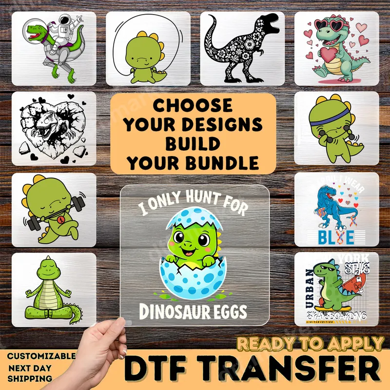 See allUnleash prehistoric fun with this adorable 'I ONLY HUNT FOR DINOSAUR EGGS' DTF transfer. This vibrant design features a cheerful baby dinosaur, freshly hatched from a speckled blue egg, beaming with excitement. The playful typography perfectly complements the cute dino, making it an irresistible design for any young adventurer. This ready to press transfer is perfect for adding a touch of prehistoric charm to any fabric item. This charming heat transfer is ideal for kids and anyone who loves dinosaurs, especially young paleontologists in training! It's a fantastic choice for birthday gifts, themed parties, or simply to brighten up everyday wear for your little one. Parents looking for unique iron on decals for their children's clothing will adore this design. It’s perfect for creating custom shirts for family outings to museums or playgrounds, or even for baby showers. Applying this professional-grade heat press design is incredibly easy. Our direct to film transfers adhere beautifully to a wide range of fabrics, including cotton, polyester, and their blends. For best results, use a heat press at 300-325°F for 15 seconds with medium pressure. It can also be applied with a household iron with firm, even pressure. Say goodbye to tedious weeding; these ready to press transfers simplify your crafting process, allowing you to create custom apparel effortlessly. Experience superior quality with our DTF transfers. This apparel transfer boasts vibrant, true-to-color inks that resist cracking and peeling, ensuring your designs last wash after wash. The finished product has a soft, flexible feel, seamlessly blending with the fabric without stiffness. Crafted with professional DTF film and strong adhesive, this shirt design provides exceptional durability and a premium finish. Create eye-catching, long-lasting custom pieces with confidence.