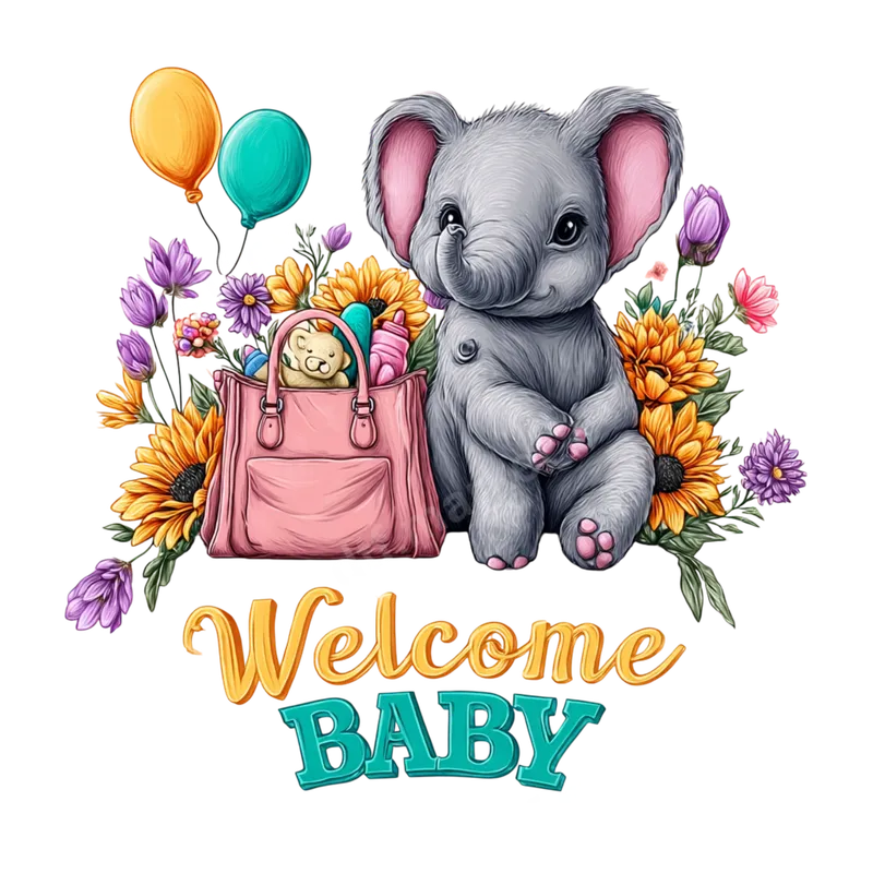 See allThis charming DTF transfer features an endearing baby elephant, rendered with soft gray tones, pink ears, and toes. The scene includes sunflowers, floral accents, festive balloons, and a sweet pink diaper bag with a teddy bear. Below, "Welcome BABY" is playfully displayed in a cheerful, multi-colored font. This ready to press design encapsulates joy and celebration for a new arrival. This delightful heat transfer is perfect for expectant parents, grandparents, or anyone celebrating a new addition. It's an ideal design for baby shower gifts, gender reveals, hospital arrival announcements, or custom apparel. Use this iron on transfer to personalize nursery decor, create memorable keepsakes, or craft unique gifts for friends and family welcoming a baby. Our direct to film transfer technology ensures excellent adhesion and vibrant colors on various fabrics like cotton, polyester, and blends. For best results, apply with a heat press at 300-325°F for 15 seconds with medium pressure, then cool peel. It can also be applied using a household iron with firm, even pressure. Enjoy the convenience of a ready to press design with no weeding required. Experience professional-grade results with our high-quality DTF transfers. Each t-shirt transfer is meticulously printed to deliver vibrant colors, crisp details, and exceptional durability. The specialized DTF film ensures a soft feel that resists cracking and peeling, even after multiple washes. With strong adhesive backing, your custom transfer will securely bond to garments, providing a long-lasting, professional finish.
