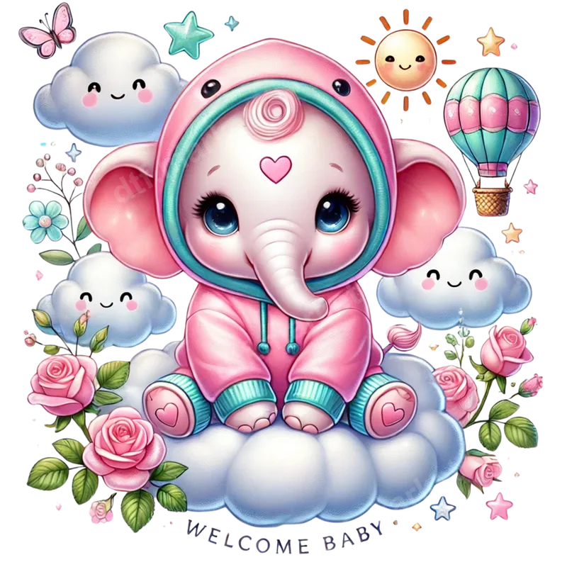 Cute Baby Elephant Welcome Baby DTF Transfer | Pink Hoodie & Clouds