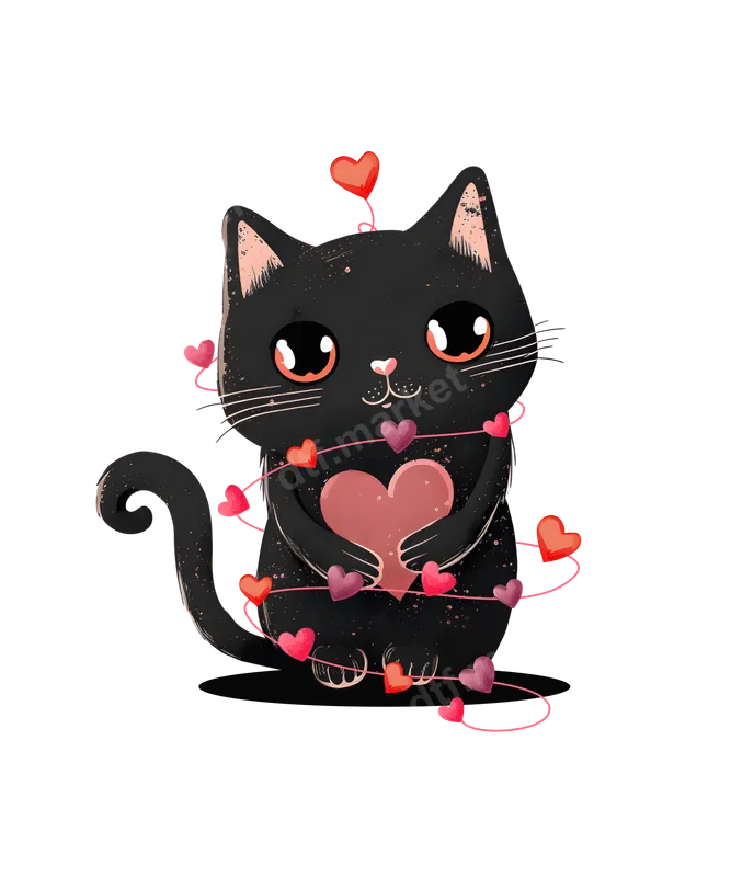 Cute Black Cat Holding Heart DTF Transfer with Love Hearts | Ready to Press Apparel Design