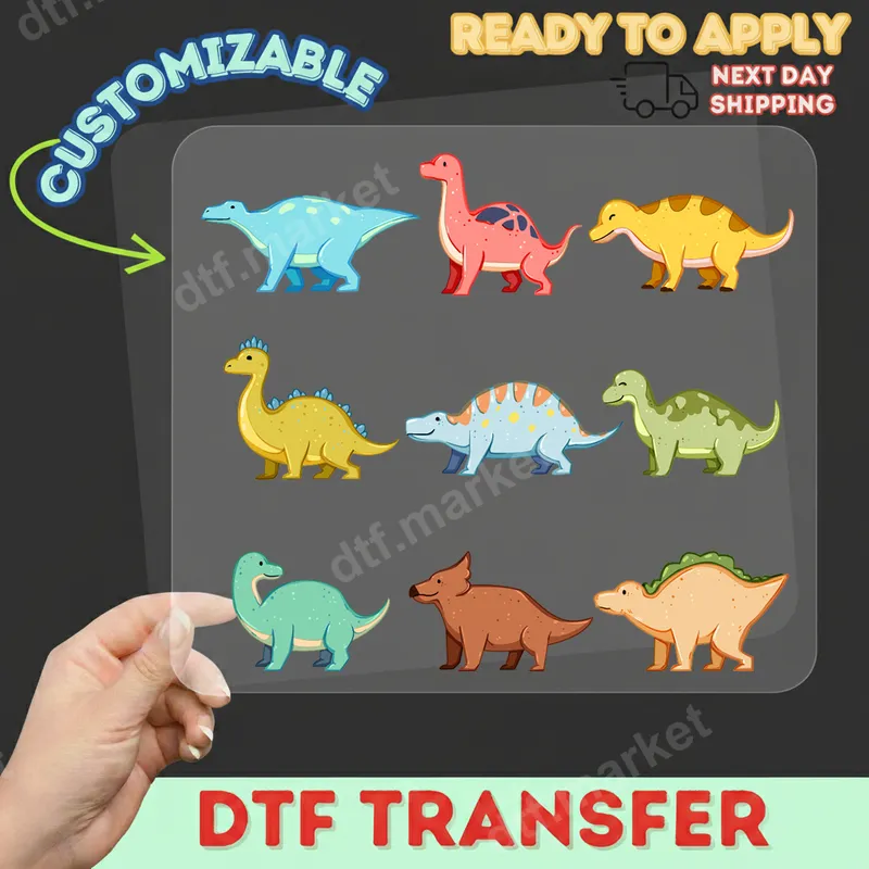 See allThis playful DTF transfer features an adorable collection of various cartoon dinosaurs, each bursting with bright, cheerful colors like sky blue, coral pink, sunny yellow, and mint green. From long-necked gentle giants to charming stegosaurus-like creatures, these friendly prehistoric pals are designed to bring a smile to anyone's face. This ready to press transfer is perfect for adding a touch of whimsy and adventure to any garment or accessory. Ideal for young paleontologists, dinosaur enthusiasts, or anyone who loves cute and colorful designs, this heat press design is perfect for children's birthdays, back-to-school outfits, or simply everyday wear. Create unique gifts for kids, baby shower presents, or custom apparel for family vacations. It's a fantastic iron on transfer for crafting personalized items that stand out. Applying this high-quality direct to film transfer is incredibly easy! It works seamlessly on a wide range of fabrics, including cotton, polyester, and various blends. For best results, use a heat press at 300-325°F for 15 seconds with medium pressure, then peel cold. You can also achieve great results with a household iron. Best of all, there's absolutely no weeding required, making your crafting projects quick and hassle-free. Our DTF transfers are crafted using premium film and inks, ensuring vibrant, long-lasting colors that won't crack, peel, or fade, even after multiple washes. The professional-grade heat press transfer provides a soft, flexible feel that integrates beautifully into the fabric. Experience professional-quality apparel transfers with incredible detail and durability, making your custom creations truly special.
