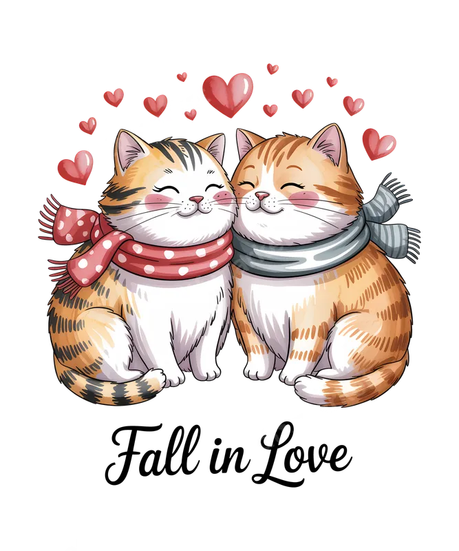 See allThis charming DTF transfer features an adorable tabby and a ginger cat snuggled together, wearing cozy scarves, surrounded by floating hearts. Below them, the sweet message "Fall in Love" is elegantly scripted. It’s a whimsical and romantic ready to press design perfect for expressing warmth and affection. This delightful design is ideal for cat parents, couples celebrating their bond, or anyone who adores cute animals and heartfelt sentiments. It makes a wonderful iron on transfer for Valentine's Day, anniversaries, birthdays, or as a thoughtful "just because" gift for a partner, friend, or family member who cherishes their feline companions. Applying this apparel transfer is simple and efficient. Use a heat press at 300-325°F for 15 seconds with medium, even pressure, then allow it to cool completely before performing a cold peel. For those without a heat press, a household iron can also achieve excellent results with firm, consistent pressure. Best of all, there’s no weeding required—just press and enjoy your new custom garment. Our professional heat press design ensures vibrant, long-lasting colors that resist cracking and peeling, even after numerous washes. Crafted from premium DTF film with strong adhesive, this t-shirt transfer boasts a remarkably soft hand feel, integrating seamlessly into any fabric. Experience a professional, durable finish that maintains its beauty wear after wear.