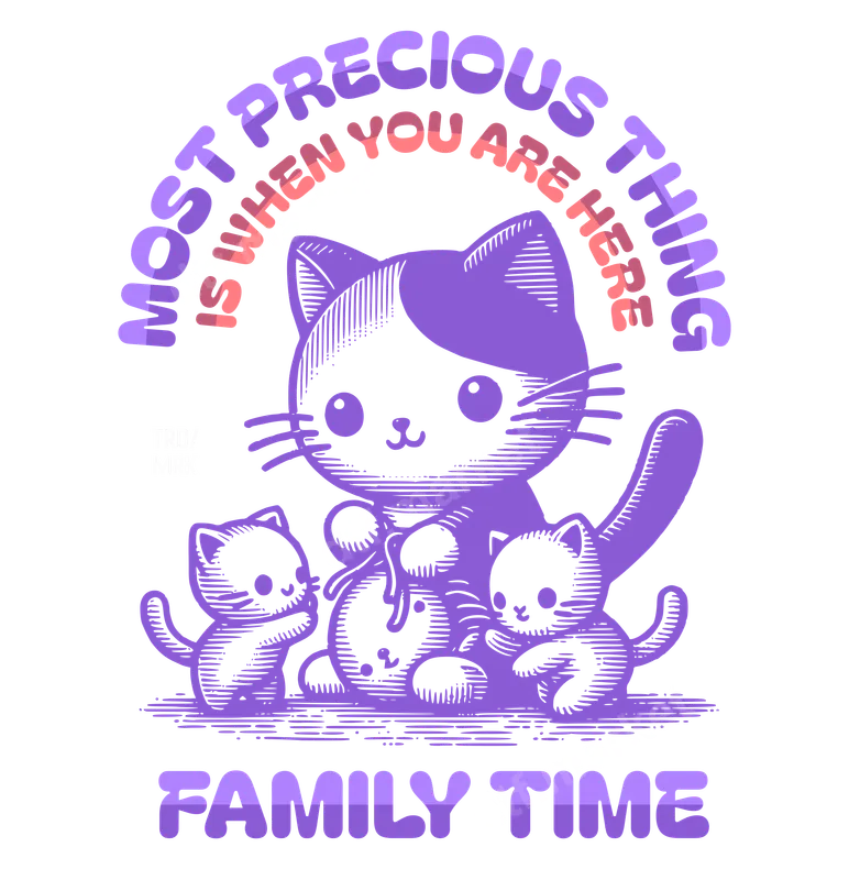 See allThis heartwarming DTF transfer features an endearing parent cat cuddling with two adorable kittens, one playfully holding a toy. The design is framed by the arched text, 'MOST PRECIOUS THING IS WHEN YOU ARE HERE,' with 'FAMILY TIME' prominently displayed below. Rendered in charming purple and peach tones with a nostalgic line art style, this ready to press transfer captures the essence of familial love and comfort. It's a perfect heat press design to celebrate togetherness. Ideal for cat enthusiasts, new parents, grandparents, or anyone who cherishes family bonds, this iron on transfer makes a thoughtful gift for Mother's Day, Father's Day, birthdays, or just because. It's a sweet way to show appreciation for loved ones and makes an excellent custom transfer for family gatherings or creating personalized apparel. This adorable design adds warmth and cuteness to any wardrobe. Our premium heat transfer is designed for easy application on a wide range of fabrics, including cotton, polyester, and cotton/poly blends. Simply apply with a heat press at 300-325°F for 15 seconds with medium pressure, then peel cold. For those without a professional heat press, a household iron can also be used with careful, even pressure. Enjoy this ready to press transfer with no tedious weeding required. Experience superior quality with our direct to film transfer, engineered for vibrant colors that pop and excellent durability. The design is crack-resistant, ensuring your apparel looks fantastic wash after wash, and the thin film offers a soft-to-touch feel. Each heat press transfer is printed on professional-grade DTF film with a strong, reliable adhesive, guaranteeing a long-lasting, professional finish for all your t-shirt transfer projects.