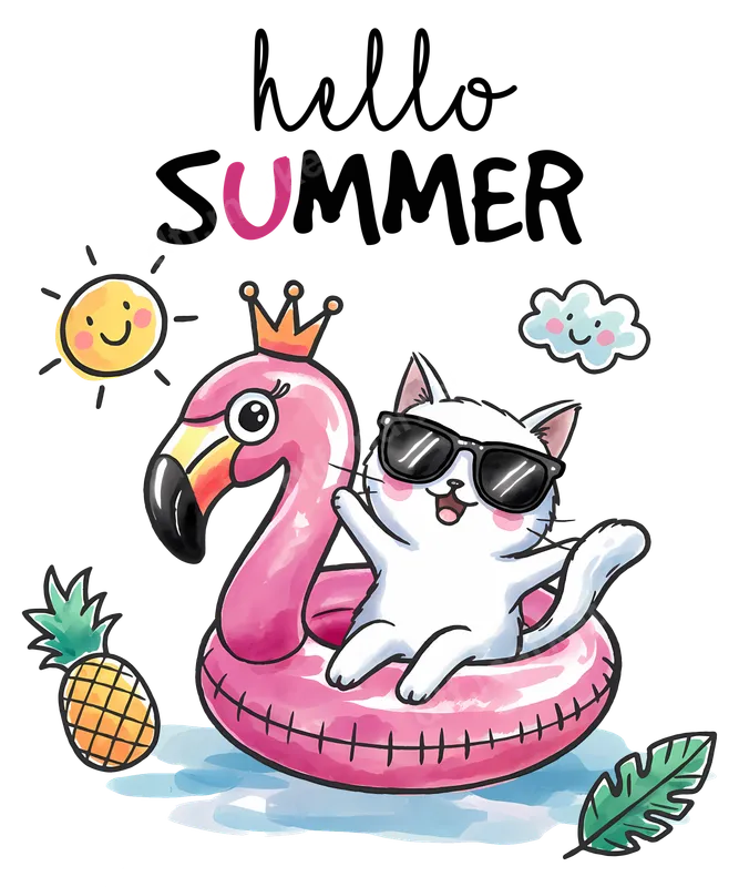 See allThis vibrant DTF transfer features an irresistibly cute white cat sporting cool sunglasses, relaxing in a pink flamingo pool float. Above this delightful scene, the playful script proclaims "hello SUMMER" with a pop of pink, setting a cheerful, vacation-ready vibe. Surrounded by a smiling sun, a fluffy cloud, a juicy pineapple, and a tropical leaf, this design is the ultimate symbol of laid-back summer fun. This ready to press transfer is perfect for bringing a smile to anyone's face. Ideal for cat enthusiasts, summer lovers, or anyone looking to add a touch of whimsy to their wardrobe, this design is perfect for beach trips, pool parties, or casual everyday wear. It makes a fantastic gift for friends, family, or even yourself, celebrating those sunny, carefree days. From children to adults, this universal design appeals to a wide audience who appreciate cute and fun apparel. Applying this heat transfer is incredibly easy with a standard heat press or even a household iron. Our high-quality direct to film transfer adheres beautifully to a wide range of fabrics, including 100% cotton, polyester, and various blends. For best results, use a heat press at 300-325°F for 15 seconds with medium pressure, then peel cold. There’s no tedious weeding required, making this ready to press transfer quick and simple to apply. Experience superior quality with our professional-grade apparel transfer. This heat press design boasts vibrant colors that pop, excellent durability that resists cracking and fading, and a soft-to-touch finish that feels great on any garment. The strong adhesive ensures your design stays put wash after wash, delivering a professional look every time.