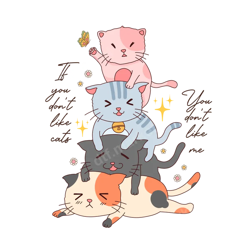 See allThis charming DTF transfer showcases an irresistible stack of four cartoon cats, each with unique color and expression, from a playful pink kitty batting at a butterfly to a sleepy calico. The design is accompanied by the witty phrase "If you don't like cats You don't like me," a perfect declaration for any feline enthusiast. This high-quality, ready to press transfer blends cuteness and sassy humor for any garment or accessory. Ideal for cat moms, pet owners, or anyone who adores their furry friends, this heat press design makes an excellent gift for birthdays, Mother's Day, or "just because." Create custom t-shirts for cat rescue events, personalized hoodies, or unique tote bags. It’s perfect for expressing your purr-sonality at casual outings, bringing joy and smiles wherever you go. Applying this iron on transfer is incredibly simple, with no weeding required, saving you time. It works beautifully on cotton, polyester, and blends, offering versatility for many projects. For best results, use a heat press at 300-325°F for 15 seconds with medium pressure. You can easily achieve professional-looking custom apparel at home with this heat press ready design. Experience vibrant colors and exceptional durability with this professional-grade direct to film transfer. Our transfers use premium DTF film and high-quality inks, ensuring they are crack-resistant, peel-resistant, and soft to the touch. The strong adhesive provides a long-lasting bond to your fabric, meaning your custom transfer design will withstand washes and wear, keeping its fresh look for years. This apparel transfer is a top-tier choice for lasting style.