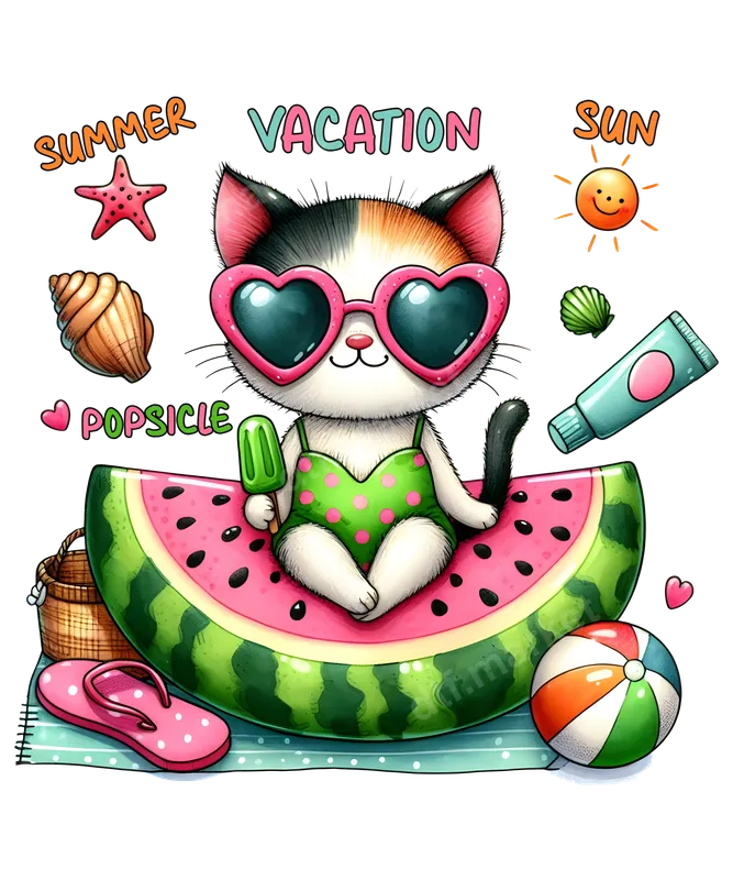 See allDive into summer with this irresistibly cute cat DTF transfer, featuring a charming calico cat in heart-shaped sunglasses and a polka-dot swimsuit, relaxing on a juicy watermelon slice. This vibrant design captures the essence of a perfect summer vacation, complete with a refreshing popsicle, sun, starfish, and beach accessories. It's a delightful, ready to press heat transfer that brings a smile to anyone's face, making it ideal for creating custom apparel or gifts. This adorable direct to film transfer is perfect for cat enthusiasts, summer lovers, and anyone who appreciates a touch of whimsical charm. It's an excellent choice for vacation apparel, beach day outfits, summer camp crafts, or simply adding a cheerful vibe to your everyday wear. Give it as a unique iron on decal gift for birthdays, holidays, or just because to friends, family, or kids who adore cute animals and sunny days. Imagine this design on matching shirts for a family trip! Applying this professional heat press design is incredibly simple, making it accessible for both experienced crafters and beginners. Our high-quality apparel transfer works beautifully on a wide range of fabric types, including cotton, polyester, and various blends. For best results, use a heat press at 300-325°F for 15 seconds with medium, even pressure. Unlike traditional vinyl transfers, there's no tedious weeding required, saving you time and effort to create stunning projects quickly. Experience superior quality with our durable DTF transfers. Each shirt design boasts incredibly vibrant colors and sharp details that remain crack-resistant and soft to the touch, even after multiple washes. Crafted using professional DTF film with a strong, flexible adhesive, these transfers ensure a long-lasting finish that feels integrated into the garment rather than sitting on top. Elevate your wardrobe with a premium, ready to press transfer that stands the test of time.