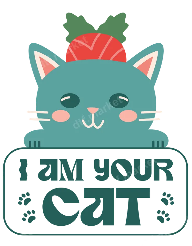 See allThis charming design features a sweet teal cat peeking over a sign that proudly declares "I AM YOUR CAT," complete with whimsical paw prints. Adorned with a festive red and green holly hat, this delightful image captures the playful spirit of the season and your beloved feline friend. It's a perfect DTF transfer for adding holiday cheer to any garment, and it comes ready to press. Ideal for cat owners, pet parents, and anyone who loves holiday whimsy, this design makes a fantastic gift for Christmas, birthdays, or just because. Imagine it on a cozy sweatshirt for a winter gathering, a fun t-shirt for holiday parties, or as a unique stocking stuffer for the cat enthusiast. This heat press transfer is a wonderful way to show off your feline devotion. Applying this vibrant iron on design is a breeze. Our high-quality DTF transfers work beautifully on a wide range of materials, including cotton, polyester, and various blends. For best results, use a heat press at 300-325°F for 15 seconds with medium, even pressure. This design requires absolutely no weeding, saving you time. You'll be amazed by the professional finish and durability of this t-shirt transfer. Each design is printed with high-definition inks on premium DTF film, ensuring vibrant colors that resist cracking and fading even after many washes. The soft-touch feel and strong adhesive provide a long-lasting, comfortable result on your customized apparel.