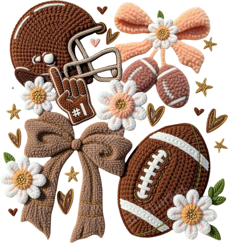 See allThis charming DTF transfer features a unique collection of football-themed elements rendered in a cozy, crochet-knit style. You'll find a classic football helmet, a detailed football, a "number 1" foam finger, elegant bows, and sweet daisy-like flowers, all intertwined with small hearts and stars. The soft, textured appearance gives this design a handmade, comforting vibe, making it perfect for those who love both sports and crafty aesthetics. This high-quality direct to film transfer is ready to press onto your favorite apparel. This design is ideal for football moms, cheer sisters, female fans, or anyone who wants to show their team spirit with a touch of feminine charm. It's perfect for game days, tailgates, pep rallies, or as a thoughtful gift for a coach, player, or avid supporter. Use it to create personalized gifts for birthdays, holidays, or end-of-season celebrations. It's a great way to celebrate the love of the game in a unique and stylish way. Applying this ready to press transfer is incredibly easy with a heat press or even a household iron. Our DTF transfers work beautifully on a wide variety of fabrics, including cotton, polyester, and their blends. For best results with a heat press, apply at 300-325°F for 15 seconds with medium, even pressure. Unlike traditional vinyl transfer, there's absolutely no weeding required, saving you time and effort. Just press and peel! Experience the professional quality of our DTF heat transfers. Each design boasts vibrant colors, exceptional detail, and a soft, flexible feel that won't crack or peel. Made with premium DTF film and strong adhesive, these apparel transfers are designed for durability and a long-lasting finish on your garments. Enjoy professional-grade results that stand up to washes and wear, creating stunning customized items every time.