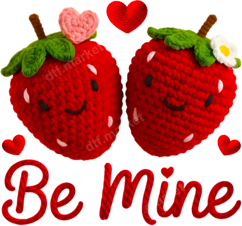 See allThis charming DTF transfer showcases two delightful crocheted strawberries with sweet, happy expressions, adorned with a heart and flower. Below, "Be Mine" is rendered in a red yarn-textured font, complemented by tiny floating hearts. It's a whimsical and romantic ready to press design, perfect for expressing affection with a cozy, handmade aesthetic. This direct to film transfer brings sweetness to any personalized item. This design is ideal for couples, sweethearts, or anyone wanting to spread love. It’s perfect for Valentine’s Day gifts, anniversary celebrations, or showing appreciation to friends or family. Imagine matching shirts for a romantic outing or a cute tote bag. This versatile heat transfer makes an excellent gift for romantics and those who love unique, cute apparel. Applying this heat press transfer is incredibly easy, suitable for both experienced crafters and beginners. It works beautifully on cotton, polyester, and various fabric blends. For best results, use a heat press at 300-325°F for 15 seconds with medium pressure. A household iron can also be used. This isn't a vinyl transfer that requires weeding; it's a full-color, ready-to-apply iron on decal. Our premium DTF transfers boast exceptional quality, ensuring your finished product looks professional and lasts. Colors are vibrant, maintaining brilliance wash after wash. Transfers are crack-resistant and offer a soft, smooth feel, seamlessly integrating with the fabric. Each heat press design is printed on professional DTF film with a strong adhesive, guaranteeing a durable apparel transfer for all your creative projects.