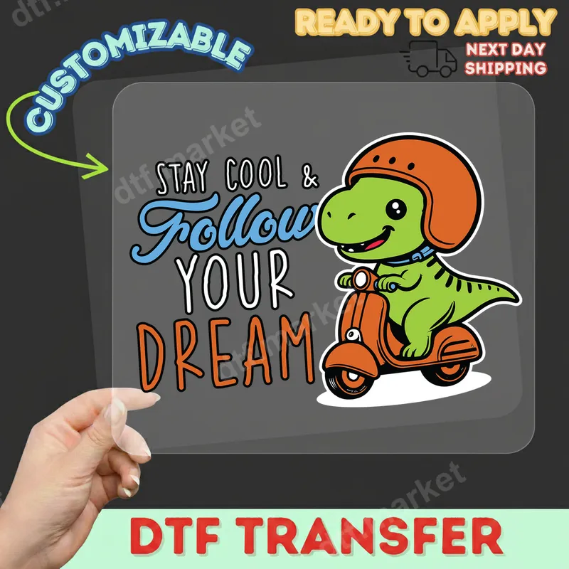 See allThis delightful DTF transfer features an irresistibly cute green dinosaur, sporting a cool orange helmet, confidently riding a matching orange scooter. The design is complemented by the inspiring phrase, "STAY COOL & FOLLOW YOUR DREAM," rendered in a playful mix of typography. This vibrant, ready to press design exudes positivity and a sense of cheerful adventure, perfect for adding a unique touch to any garment. Ideal for young adventurers, dinosaur enthusiasts, or anyone who appreciates a splash of whimsy and motivation. This heat transfer is perfect for creating custom apparel for birthdays, back-to-school outfits, or simply everyday wear that inspires. It makes a fantastic personalized gift for children, grandchildren, or a fun, encouraging treat for yourself. Parents and crafters will love adding unique, positive messages to their creations. Applying this high-quality iron on transfer is a breeze, whether you're using a professional heat press or a household iron. Our direct to film transfer adheres beautifully to a wide range of fabrics, including cotton, polyester, and various blends. For best results, use a heat press at 300-325°F for 15 seconds with medium pressure, then peel cold. Say goodbye to tedious weeding—this design comes heat press ready! Experience professional-grade results with our premium apparel transfer. Each design boasts incredibly vibrant colors and sharp details, ensuring your finished product stands out. Our DTF film is engineered for excellent durability, resisting cracking and fading even after multiple washes. The final print has a soft, flexible feel that seamlessly integrates with the fabric, providing comfort and a long-lasting, high-quality finish.