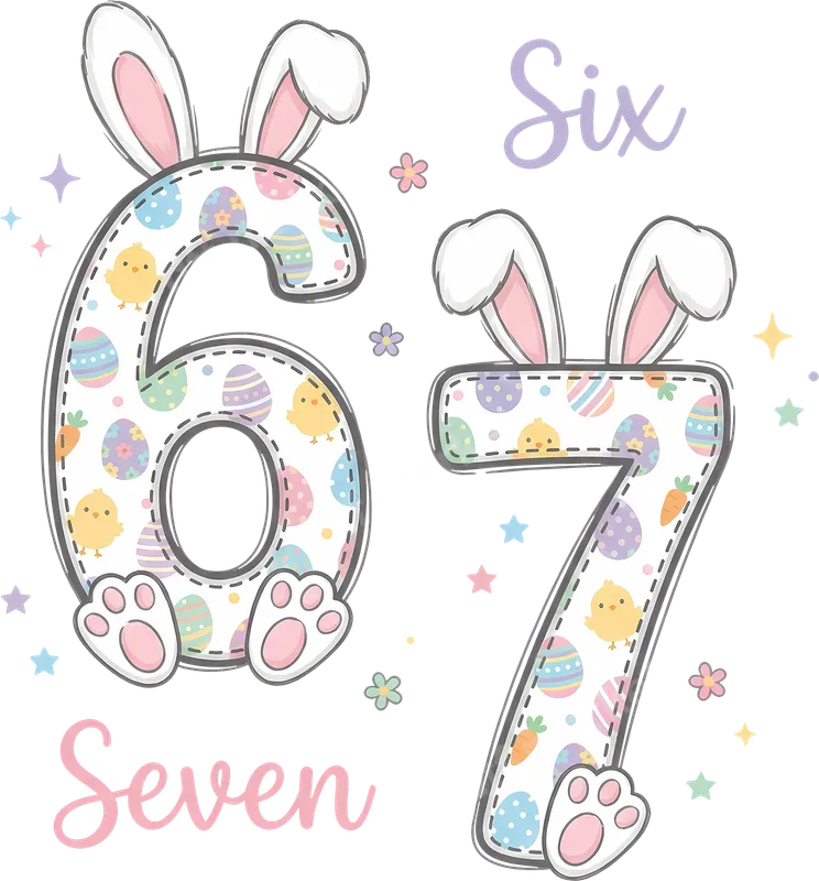 See allThis charming DTF transfer features numbers "6" and "7" in a whimsical, pastel Easter theme. Each is adorned with adorable bunny ears and soft pink paws, filled with a delightful pattern of decorated Easter eggs, fluffy yellow chicks, and tiny carrots. The design has a cute, stitched appliqué look, making it a perfect ready to press graphic for adding springtime joy to any garment. It’s ideal for celebrating a special birthday or festive occasion. Designed for young ones, this vibrant heat transfer is perfect for children celebrating their sixth or seventh birthday, especially if it falls around Easter. It's an excellent choice for parents or grandparents creating unique birthday outfits, personalized gifts, or festive apparel for Easter egg hunts. Imagine this sweet design on a toddler's t-shirt, a child's hoodie, or a cute tote bag for treats. Applying this professional DTF transfer is incredibly simple. It's compatible with a wide range of fabrics, including cotton, polyester, and blends, ensuring versatility. For best results, use a heat press at 300-325°F for 15 seconds with medium pressure. Unlike traditional vinyl transfer sheets, no tedious weeding is required – just press and peel for a seamless finish. A household iron can also be used for smaller applications, following similar guidelines. Crafted with premium materials, this direct to film transfer boasts exceptional durability and vibrant colors that resist cracking and fading, even after multiple washes. The soft-touch finish integrates beautifully with your chosen garment, providing a comfortable feel. Each iron on decal is produced using high-quality DTF film and strong adhesive, ensuring a long-lasting, professional-grade result that truly stands out. Create memorable apparel with ease and confidence.