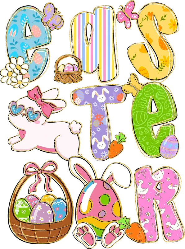 See allThis adorable "EASTER" DTF transfer brings a burst of springtime joy to any garment. The design features the word "EASTER" spelled out in playful, decorative letters, each adorned with unique patterns like pastel stripes, floral motifs, bunny faces, and colorful Easter eggs, all outlined with a shimmering golden glitter. Accompanying the festive text are charming illustrations, including a cool bunny sporting heart-shaped sunglasses and a pink bow, baskets brimming with decorated eggs, and a cute bunny-eared egg holding a carrot. This ready to press design is perfect for adding a touch of whimsy and celebration to your holiday creations. This vibrant design is ideal for anyone looking to celebrate the Easter season in style. It's perfect for creating custom shirts for kids, toddlers, and babies attending Easter egg hunts or family gatherings. Craft matching outfits for family photos, decorate tote bags for collecting eggs, or even make unique gifts for friends and loved ones. Small businesses can also utilize this popular design to create charming apparel for their holiday inventory, appealing to parents and grandparents alike. Our DTF heat transfers are incredibly versatile and can be applied to a wide range of fabric types, including cotton, polyester, and various blends. Applying this iron on transfer is a breeze: simply use a professional heat press at 300-325°F for 15 seconds with medium pressure, then cold peel the film. For those without a heat press, a household iron can also achieve fantastic results with careful application. Unlike traditional vinyl transfers, there's no tedious weeding required, making your crafting process smooth and enjoyable. Experience superior quality with our direct to film transfers. Crafted using professional-grade DTF film and vibrant inks, this design offers exceptional color brilliance and crisp details that truly stand out. The durable transfer is crack-resistant, ensuring your apparel maintains its cheerful look wash after wash. The finished product is soft to the touch, providing comfortable wear without a bulky feel. This heat press ready transfer adheres strongly, creating a long-lasting and professional-looking finished garment every time.