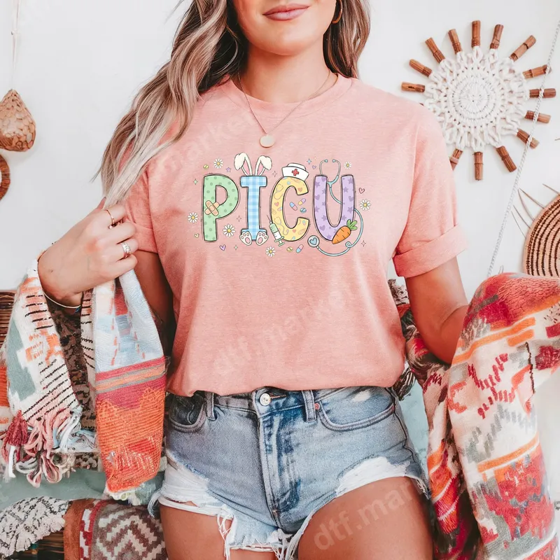 See allShow your dedication to the Pediatric Intensive Care Unit with this charming Easter-themed PICU DTF transfer! This delightful ready to press design features 'PICU' in a playful, bubbly style with vibrant pastel colors and whimsical patterns. Each letter is adorned with cute details like bunny ears, a nurse's cap, a stethoscope, and a carrot, surrounded by tiny hearts, flowers, and band-aids. It’s a perfect touch of spring cheer for your scrubs or casual wear. This adorable heat press transfer is ideal for dedicated PICU nurses, medical staff, and healthcare heroes. It's an excellent apparel transfer for celebrating Easter, spring, Nurse Appreciation Week, or as a thoughtful gift for a colleague, friend, or family member in pediatric intensive care. Show off your specialty with festive flair that brings smiles to everyone, especially little patients. Applying this professional-grade DTF transfer is incredibly easy. Our ready to press transfer adheres beautifully to cotton, polyester, and blends. For best results, use a heat press at 300-325°F for 15 seconds (cold peel). A household iron works for smaller projects too! There’s no weeding required, unlike traditional iron on transfer applications. Experience superior quality with our durable heat press design. Each t-shirt transfer offers vibrant colors, crisp details, and exceptional durability, resisting cracking and fading. The soft-touch finish ensures comfort. Our premium DTF film and strong adhesive guarantee a long-lasting, professional finish. Get ready for compliments on your unique and heartfelt apparel!
