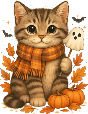 Cute Halloween Cat DTF Transfer | Autumn Kitten, Ghost & Pumpkins