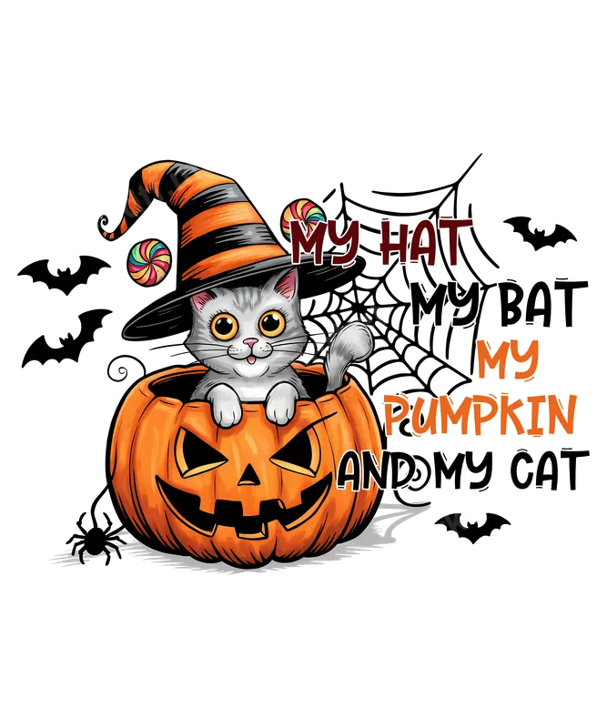 See allEmbrace the spirit of Halloween with our adorable 'My Hat My Bat My Pumpkin And My Cat' DTF transfer. This charming design features a fluffy gray kitten peeking from a carved jack-o'-lantern, wearing a striped witch hat with colorful lollipops. Spooky bats and a spiderweb frame the playful text, making this ready to press transfer a delightful addition to your festive wardrobe. It’s the perfect blend of cute and spooky for the holiday season. This unique design is ideal for cat lovers, Halloween enthusiasts, and anyone who enjoys whimsical, festive apparel. It makes an excellent gift for friends, family, or yourself, perfect for Halloween parties, trick-or-treating, or simply showcasing holiday cheer throughout October. This direct to film transfer adds a personalized touch to any garment, celebrating the cutest side of spooky season. Our premium DTF transfer ensures easy application on cotton, polyester, and blends. Achieve professional results using a heat press at 300-325°F for 15 seconds with medium pressure, then cool peel. For home crafters, a household iron can also be used. Unlike traditional vinyl transfers, no weeding is required. Simply press and wear – it’s that easy to create custom t-shirts or other apparel with this heat press ready design. Experience vibrant colors and exceptional durability with our high-quality heat press transfers. Printed on professional-grade DTF film, these iron on transfers ensure crisp details and a soft, smooth feel. They are highly crack-resistant, maintaining their vivid look wash after wash. Transform your apparel into personalized masterpieces with a heat press design that stands out and lasts, perfect for creating unique shirt designs or any apparel transfer.