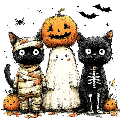 Cute Halloween Cats Ghost DTF Transfer - Mummy Skeleton & Pumpkin Trio