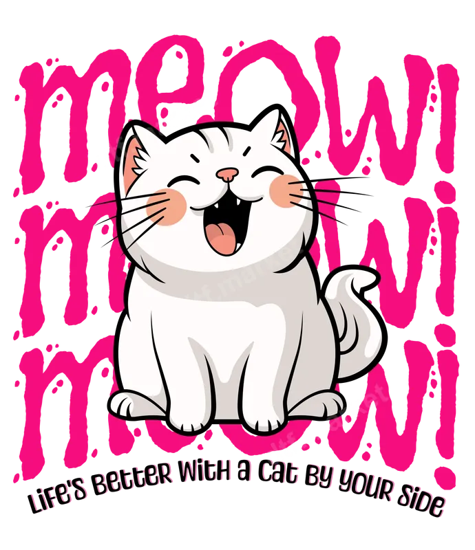 See allUnleash your inner cat enthusiast with this incredibly cute and vibrant DTF transfer! Featuring an irresistibly happy, chibi-style white cat with wide-open mouth expressing pure joy, this design is framed by bold, distressed pink "MEOW!" text and the heartwarming sentiment "LIFE'S BETTER WITH A CAT BY YOUR SIDE." This high-quality DTF transfer is ready to press, making it easy for you to personalize your favorite apparel. This delightful design is perfect for cat owners, pet lovers, and anyone who adores playful feline charm. It makes an excellent gift for birthdays, holidays, or just because, ideal for teens, women, and animal enthusiasts looking to express their affection for their furry friends. Showcase your love for cats at casual gatherings, pet events, or simply in your everyday wear. Applying this iron on transfer is a breeze! Designed for versatility, it adheres beautifully to a wide range of fabrics including cotton, polyester, and various blends. For professional results, use a heat press at 300-325°F for 15 seconds with medium pressure. Even a household iron can achieve great results by pressing firmly and evenly. Best of all, there's no tedious weeding required – just press and peel! Experience superior quality with our direct to film transfer. This apparel transfer boasts vibrant, long-lasting colors that resist cracking and fading, ensuring your design looks fantastic wash after wash. The soft-touch finish integrates seamlessly with your garment, providing maximum comfort and durability. Elevate your wardrobe with a professional-grade design that celebrates your love for cats.