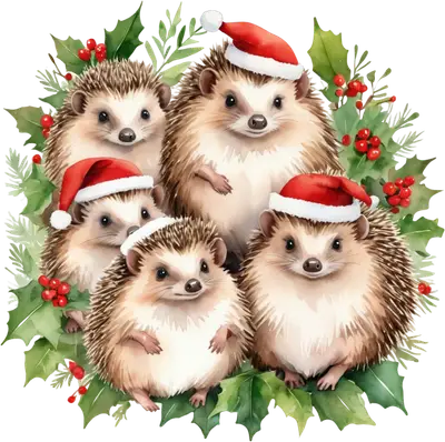 Cute Hedgehog Family Christmas DTF Transfer with Santa Hats & Holly