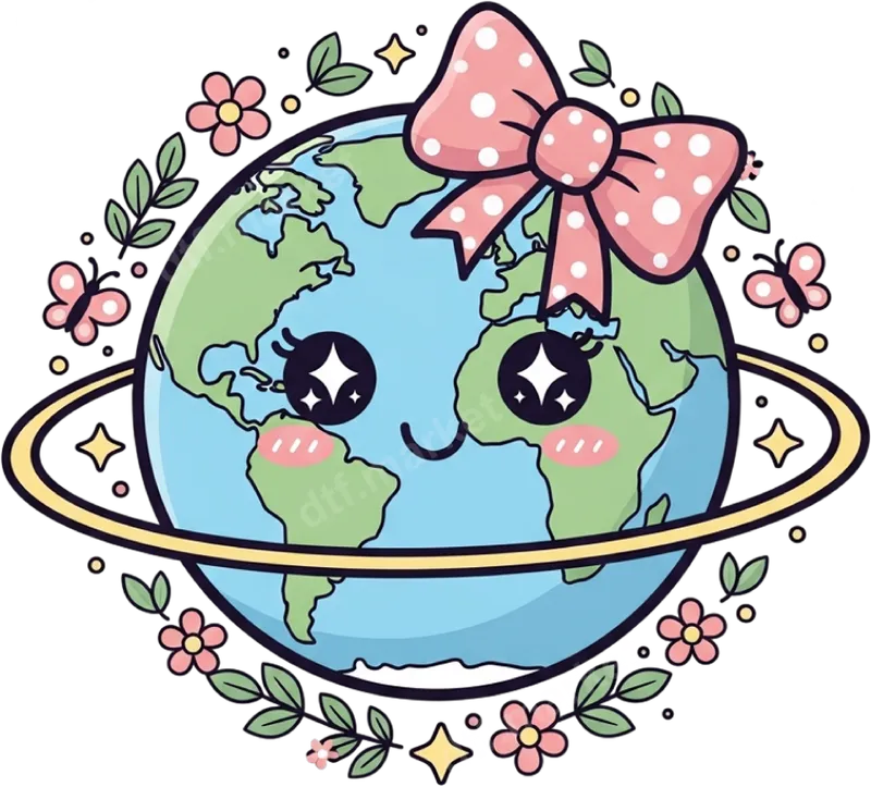 Cute Kawaii Earth Planet with Pink Bow DTF Transfer Design