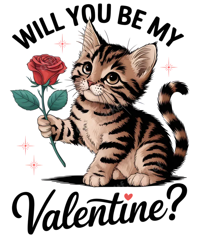See allThis heartwarming DTF transfer features an irresistibly cute tabby kitten, holding a vibrant red rose, with the sweet question 'Will You Be My Valentine?' in playful typography. This ready to press design captures the essence of kitten love, making it a charming addition to any garment. The detailed artwork showcases the kitten's soft fur and innocent gaze, perfect for cat lovers and romantics. An instant classic for Valentine's Day apparel. Ideal for cat lovers, romantics, and anyone celebrating Valentine's Day, this heat press transfer makes a wonderful personalized gift. Create custom t-shirts, unique hoodies, or adorable tote bags for your loved ones. It's perfect for school events, gifting to a significant other, or simply spreading some love. This charming iron on decal can also be a delightful surprise for a secret admirer. Our high-quality, heat press ready transfers are incredibly easy to apply, suitable for cotton, polyester, and various fabric blends. For best results, use a heat press at 300-325°F for 15 seconds with medium pressure. No complicated weeding is required; simply press and peel! Even with a household iron, you can achieve fantastic results, making custom apparel creation accessible. Full instructions are included for flawless application. Experience professional-grade results with our durable and vibrant direct to film transfer. The colors are brilliant and long-lasting, designed to withstand numerous washes without cracking, peeling, or fading. Our t-shirt transfer boasts a soft, lightweight feel on your garment, ensuring maximum comfort. Each design is printed on premium DTF film with strong, flexible adhesive, guaranteeing a smooth, professional finish that rivals screen printing.