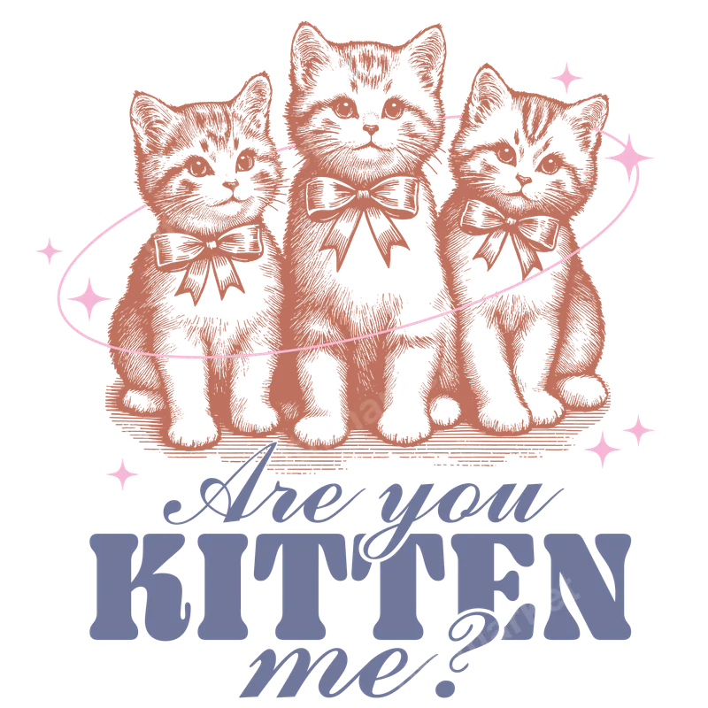 See allThis charming DTF transfer features three utterly adorable kittens, rendered in a delightful vintage etching style, complete with tiny bows and subtle sparkling accents. Below the furry trio, the playful pun 'Are you KITTEN me?' is displayed in a charming mix of script and bold lettering, making this design a truly fun and ready to press graphic for any project. It’s a purr-fect blend of cuteness and humor that’s sure to bring a smile. Ideal for cat lovers, pet owners, and anyone with a fantastic sense of humor, this apparel transfer makes an excellent gift for birthdays, holidays, or just because. Imagine it on a cozy sweatshirt for a cat mom, a playful t-shirt for a pet enthusiast, or a unique tote bag for an animal shelter volunteer. It's a versatile design that celebrates feline charm with a clever twist. Applying this heat press transfer is straightforward, whether you use a professional heat press or a household iron. For best results with a heat press, apply at 300-325°F for 15 seconds with medium pressure. No tedious weeding is required, making this an ideal iron on transfer for quick and easy customization. Just press, peel, and admire your new favorite garment. Crafted with high-quality DTF film, this shirt design boasts vibrant colors, excellent wash durability, and a soft-to-touch finish that won't crack or fade over time. The professional-grade adhesive ensures a strong, lasting bond to your chosen fabric, making your personalized items truly stand out. Enjoy a professional-looking result every time with our premium direct to film transfers.