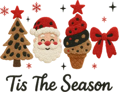 See allThis charming DTF transfer features a delightful collection of festive elements with a stylish, modern twist, celebrating the holiday spirit. The design showcases a whimsical leopard print Christmas tree topped with a red star, a cheerful Santa Claus with a big smile and fluffy beard, and a unique leopard print ice cream cone adorned with red and black scoops. A vibrant red bow adds another touch of holiday cheer, all accented by playful snowflakes and stars. Below these cheerful graphics, the phrase "Tis The Season" is scripted in a cozy, textured font, making this design perfectly ready to press for an instant festive update. This adorable design is perfect for anyone looking to add a touch of modern festive flair to their wardrobe or gifts. It's ideal for Christmas parties, family gatherings, holiday photos, or simply spreading cheer throughout the season. Small business owners, Etsy sellers, and crafters specializing in custom apparel will find this iron on transfer a fantastic addition to their holiday inventory. It makes a wonderful gift for moms, sisters, friends, and teachers who appreciate cute and trendy holiday fashion. Use this heat transfer design to create unique matching family shirts or personalized gifts that stand out. Applying this premium heat press transfer is incredibly easy, suitable for both experienced crafters and beginners. It adheres beautifully to a wide range of fabrics including cotton, polyester, cotton-poly blends, and even nylon. For best results, use a heat press at 300-325°F for 15 seconds with medium pressure, or apply with a household iron. Forget tedious weeding – just peel and press! This versatile design is perfect for custom t-shirts, cozy hoodies, comfortable sweatshirts, spacious tote bags, fun pillow covers, cute baby onesies, stylish aprons, and trendy denim jackets. For lasting durability, wash garments inside out in cold water and tumble dry low. Our ready to press transfer ensures vibrant, full-color printing with exceptional detail, bringing the unique textured look of the design to life. Enjoy a soft, flexible feel that resists cracking and stretching, unlike traditional vinyl. Each direct to film transfer is produced using high-quality inks on premium DTF film, boasting a strong adhesive backing for a professional, durable finish every time. You’ll achieve bright, crisp results that look fantastic wear after wear, making your creations truly special.