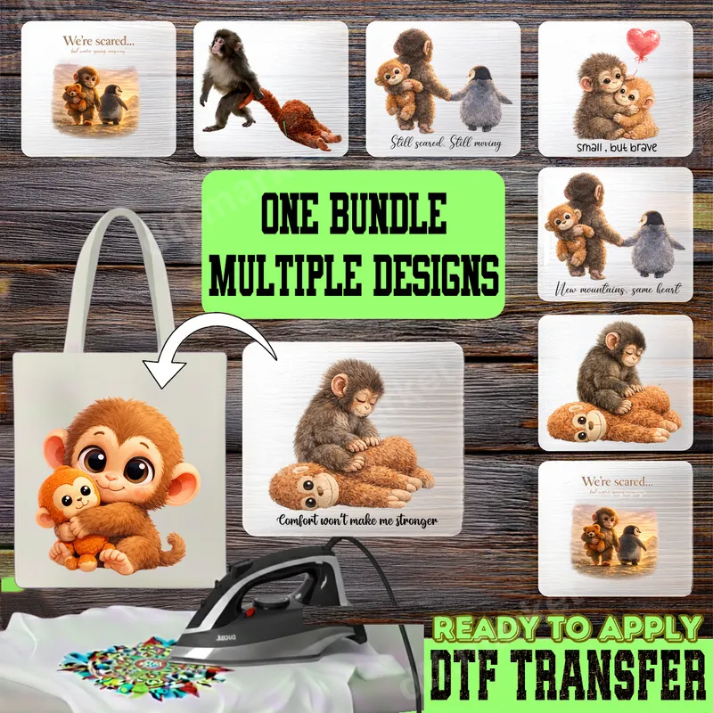 See allThis charming bundle of Direct-to-Film (DTF) transfers features an array of irresistibly cute monkey and penguin designs, many paired with uplifting and motivational quotes. From a tiny monkey finding courage with its penguin friend to a gentle monkey seeking comfort, each ready to press design brings a heartwarming touch. These vibrant images are perfect for expressing kindness, bravery, and perseverance, making them ideal for personalizing apparel with a sweet, encouraging vibe. Perfect for parents, children, animal lovers, or anyone who appreciates a dose of cuteness and inspiration, these designs make wonderful gifts for birthdays, baby showers, or simply to brighten someone's day. They’re great for creating matching family shirts, unique gifts for friends, or adding a touch of personalized cheer to everyday items. Spread positivity and adorable charm with these versatile heat transfer designs. Applying these high-quality heat press transfers is simple and mess-free. They are designed for easy application with a commercial heat press (300-325°F for 15 seconds with medium pressure) or even a household iron, making customization accessible for everyone. Our premium iron on transfers require no weeding, cutting, or layering, saving you time and effort while delivering professional-looking results on cotton, polyester, and blend fabrics. Experience the superior quality of our professional-grade DTF transfers. Each t-shirt transfer boasts vibrant colors that pop, exceptional durability, and resistance to cracking or peeling, ensuring your designs look fantastic wash after wash. The soft-touch feel and strong adhesive mean these apparel transfers integrate beautifully with your chosen garment, providing a long-lasting, comfortable finish that truly stands out.