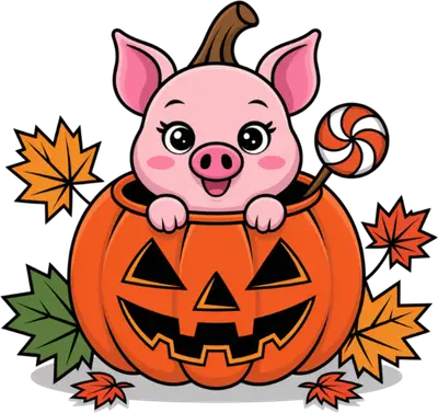 Cute Pig in Jack-o'-Lantern DTF Transfer with Lollipop & Fall Leaves