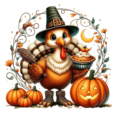Cute Pilgrim Turkey with Pie & Pumpkins DTF Transfer | Thanksgiving Fall Heat Press Design