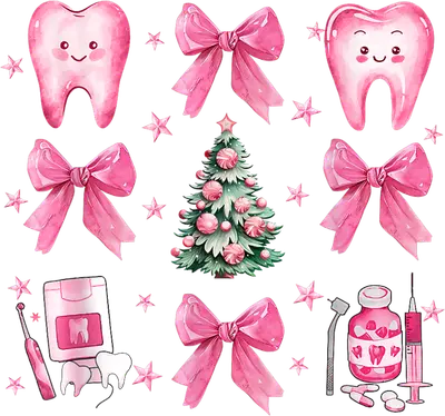 Cute Pink Christmas Dental DTF Transfer - Smiling Tooth & Bows