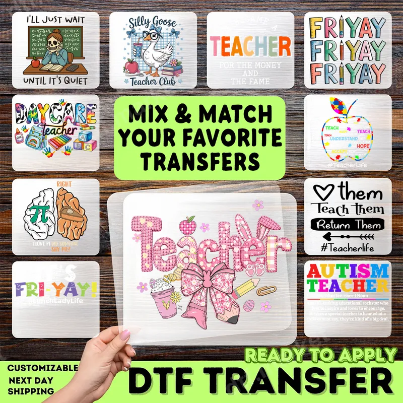 See allCelebrate the dedicated educators in your life with our charming Pink Plaid Teacher DTF transfer. This vibrant, ready-to-press design features the word "Teacher" in a playful pink plaid pattern, adorned with sweet bunny ears, a large decorative pink bow, a pencil, an apple, and a coffee cup, all surrounded by delicate blossoms. It’s a delightful way to show appreciation and add a touch of personality to any garment. This custom t-shirt transfer is perfect for teachers, educators, school staff, and anyone who wants to honor the hard work of teaching. It makes an ideal gift for Teacher Appreciation Week, end-of-year celebrations, back-to-school season, birthdays, or even Mother's Day for a teacher mom. Surprise your favorite teacher with a unique, personalized item that stands out. Applying this heat press transfer is simple and straightforward. It's compatible with cotton, polyester, and most fabric blends. For best results, use a heat press at 300-325°F for 15 seconds with medium pressure. It can also be applied with a household iron with firm, even pressure. Unlike traditional vinyl transfer, our DTF design requires no weeding, saving you time and effort. Our professional-grade DTF transfers offer exceptional quality. The colors are incredibly vibrant and durable, designed to resist cracking and fading even after multiple washes. The print feels soft to the touch, ensuring comfort on apparel. Each apparel transfer is produced using premium DTF film and strong adhesive, guaranteeing a long-lasting, professional finish on all your projects.