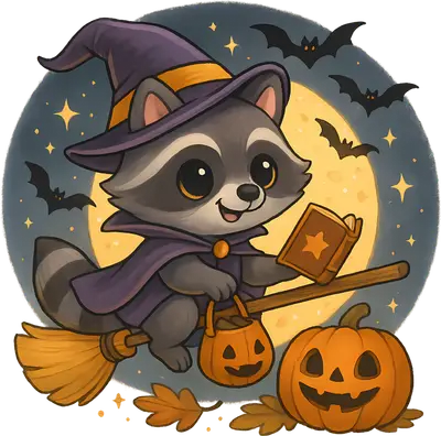 Cute Raccoon Witch Flying Halloween DTF Transfer with Pumpkin