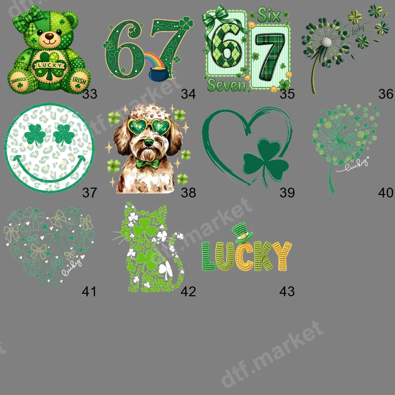 See allThis delightful DTF transfer features an irresistibly cute fluffy brown dog, donning stylish green heart-shaped sunglasses and a matching green bowtie, surrounded by shimmering four-leaf clovers. It's the perfect ready to press design to add a touch of charm and luck to your apparel. This vibrant heat press design captures the playful spirit of St. Patrick's Day with an adorable canine twist, making it an instant favorite. Ideal for dog lovers, St. Patrick's Day revelers, and anyone who appreciates a cute and festive design, this iron on transfer is fantastic for personalizing gifts, creating custom holiday outfits, or just showing off your lucky spirit. Whether you're heading to a parade, a family gathering, or simply enjoying the festivities, this design is sure to bring smiles. Applying this premium DTF transfer is effortless! It works beautifully on a wide variety of fabrics including cotton, polyester, and their blends. Simply use a heat press at 300-325°F for 15 seconds with medium pressure, or apply with a household iron. No tedious weeding is required, saving you time and ensuring a perfect application every time. Crafted with high-quality, professional DTF film, this direct to film transfer boasts incredibly vibrant colors, exceptional durability, and a soft-to-touch finish that resists cracking and peeling. Enjoy a professional-grade apparel transfer that will keep your garments looking fantastic wash after wash.