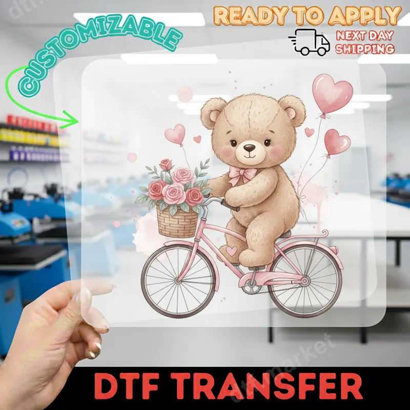 See allThis charming DTF transfer features an adorable teddy bear riding a pink bicycle, adorned with a basket full of delicate pink roses and whimsical heart-shaped balloons. The watercolor-style artwork creates a soft, romantic, and utterly sweet vibe, perfect for spreading love and cuteness. This ready to press design makes it simple to add a touch of heartfelt charm to any garment or accessory. Ideal for crafters, small businesses, or anyone looking to create unique gifts, this heat transfer is perfect for Valentine's Day, anniversaries, birthdays, or just because. It's a wonderful choice for creating matching couple shirts, charming baby clothes, or delightful items for kids and loved ones. Surprise a special someone with a personalized, thoughtful present they'll cherish. Applying this vibrant heat press design is a breeze on various fabrics including cotton, polyester, and blends. Use a heat press at 300-325°F for 15 seconds with medium pressure, or easily apply with a household iron. Our high-quality iron on transfer requires absolutely no weeding, saving you time and effort in your custom apparel projects. Experience superior quality with this professional DTF transfer. The colors are incredibly vibrant, resisting cracking and fading through countless washes. Each apparel transfer is printed on premium DTF film with a strong, durable adhesive, ensuring a soft feel and long-lasting wear. Elevate your creations with a design that looks and feels fantastic.