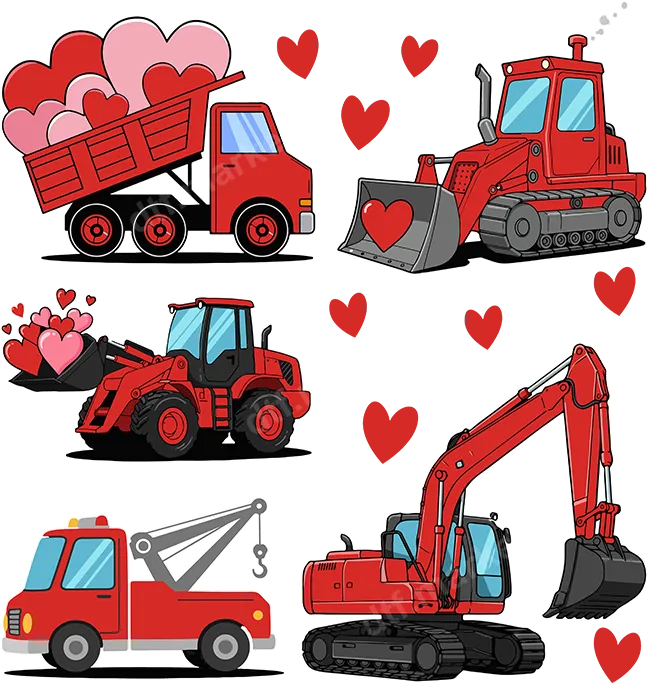 Cute Valentine's Construction Vehicles DTF Transfer - Hearts & Trucks